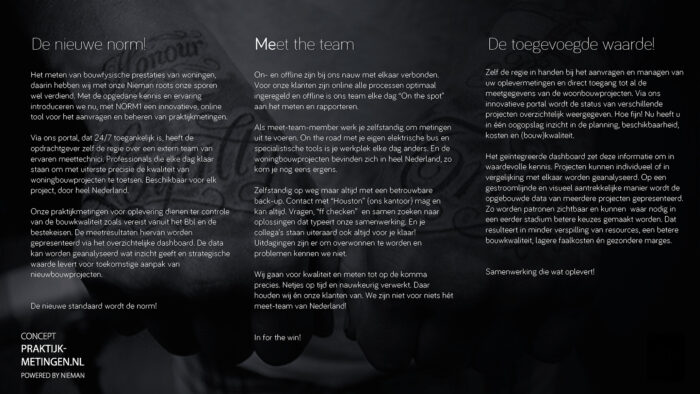 De nieuwe standaard in praktijkmetingen! Dagelijks meten wij ‘on the spot’ de bouwfysische prestaties van woningen en gebouwen op bouwprojecten door heel Nederland. Ook een praktijkmeting nodig? Word klant en regel dit eenvoudig en snel via jouw eigen Norm1 meetportaal! Kijk op www.norm1.nl